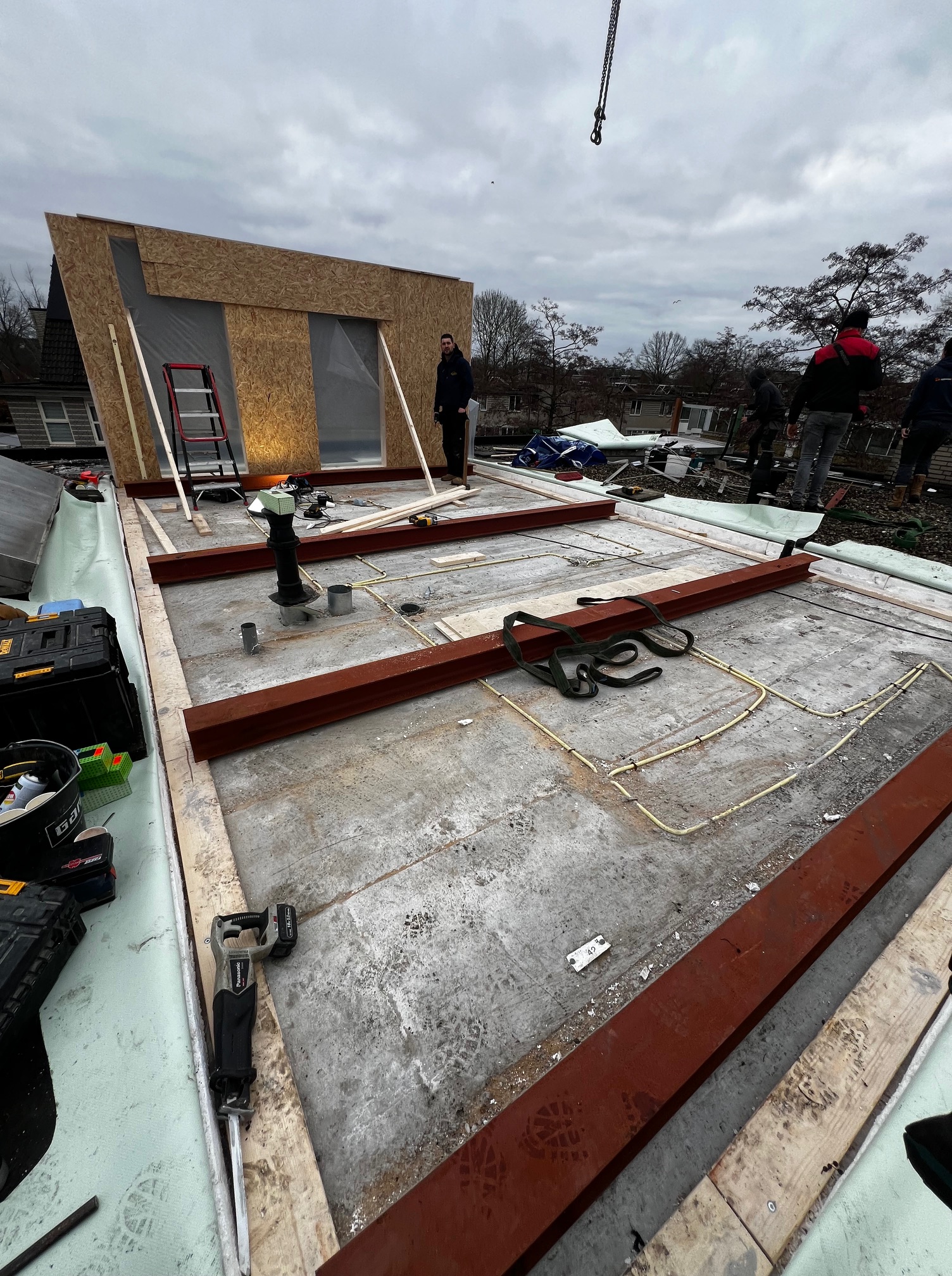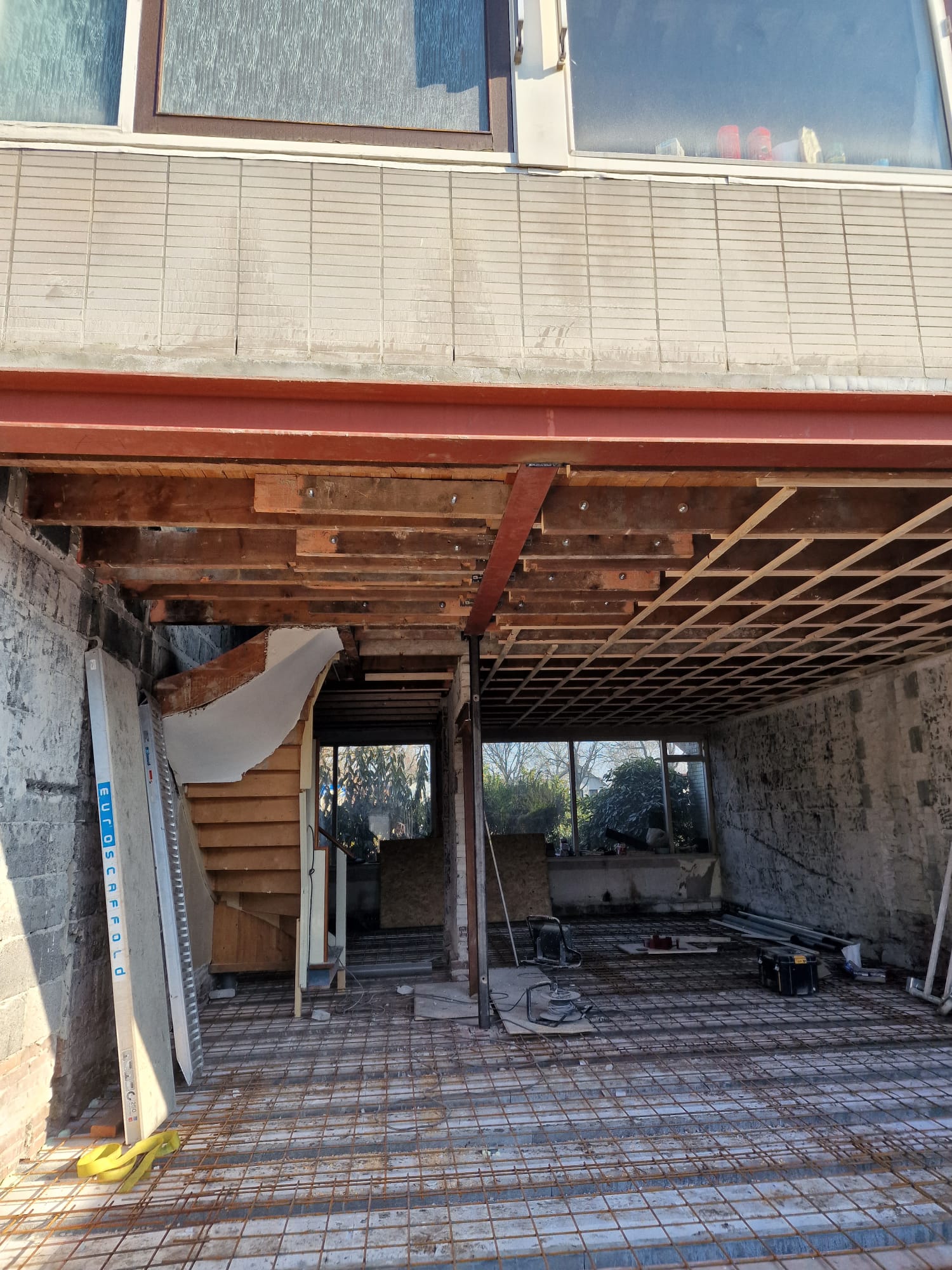 A steel structure was used to support the rear façade and interior wall. The floor was built as an insulated concrete base.