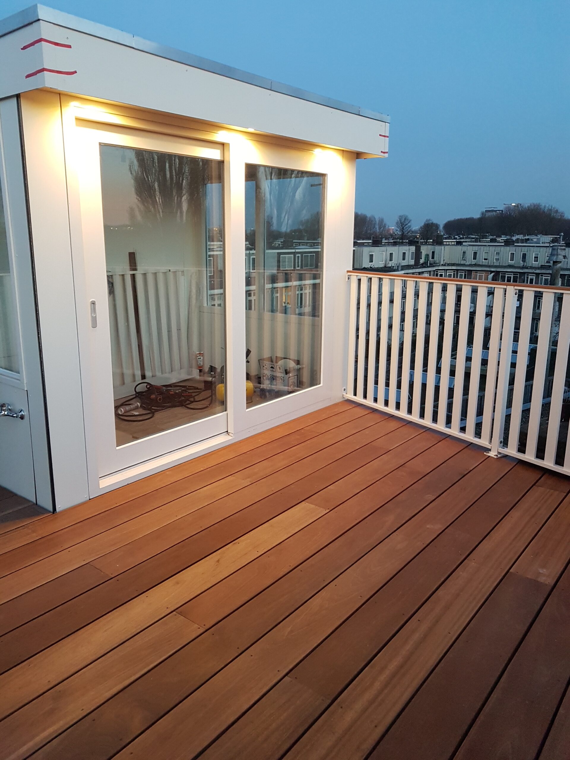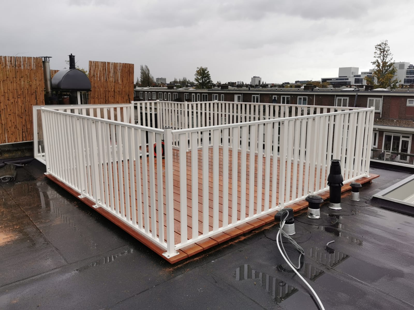 The roof terrace was built with hardwood decking boards and finished with an aluminium slatted railing.